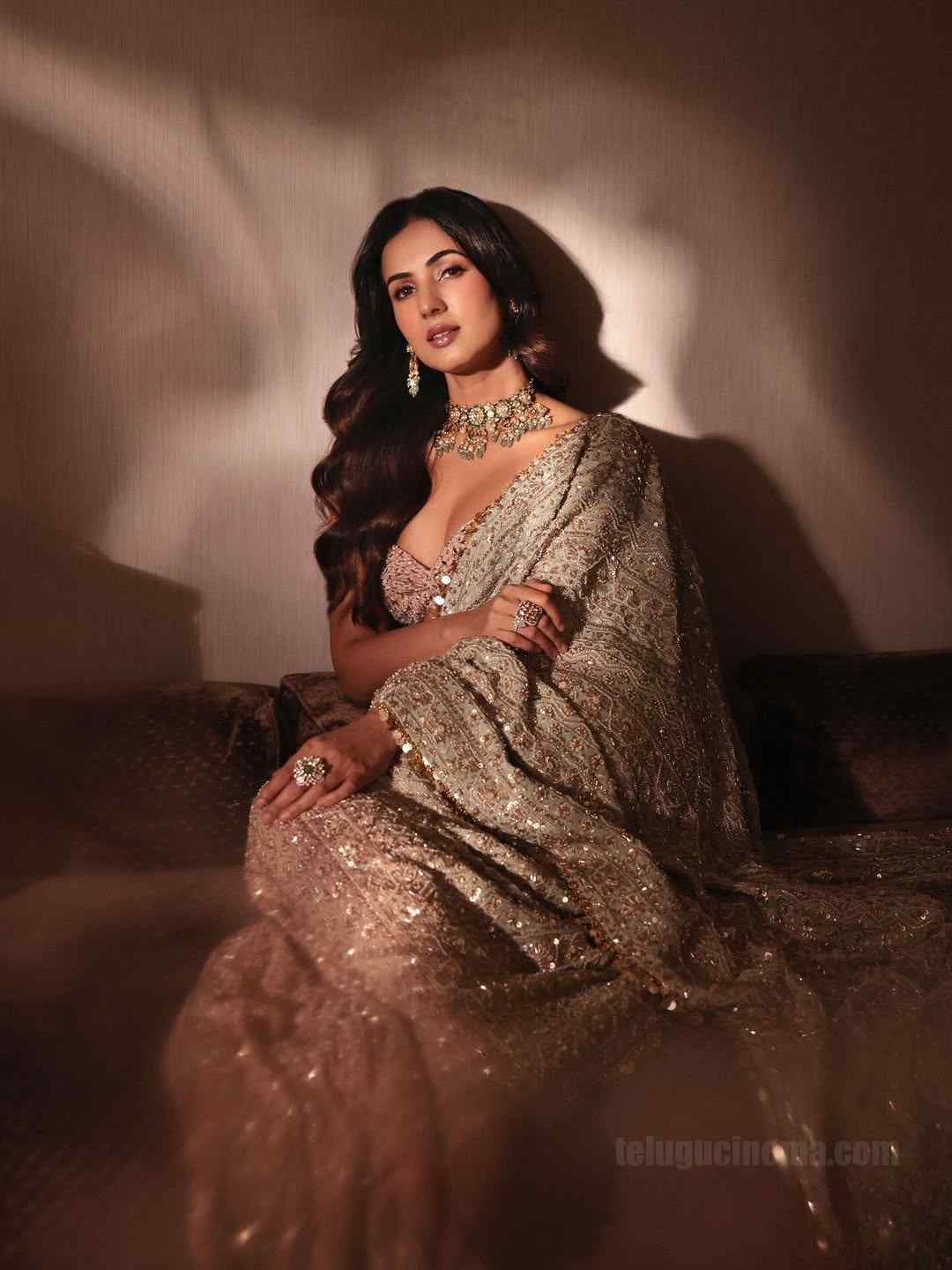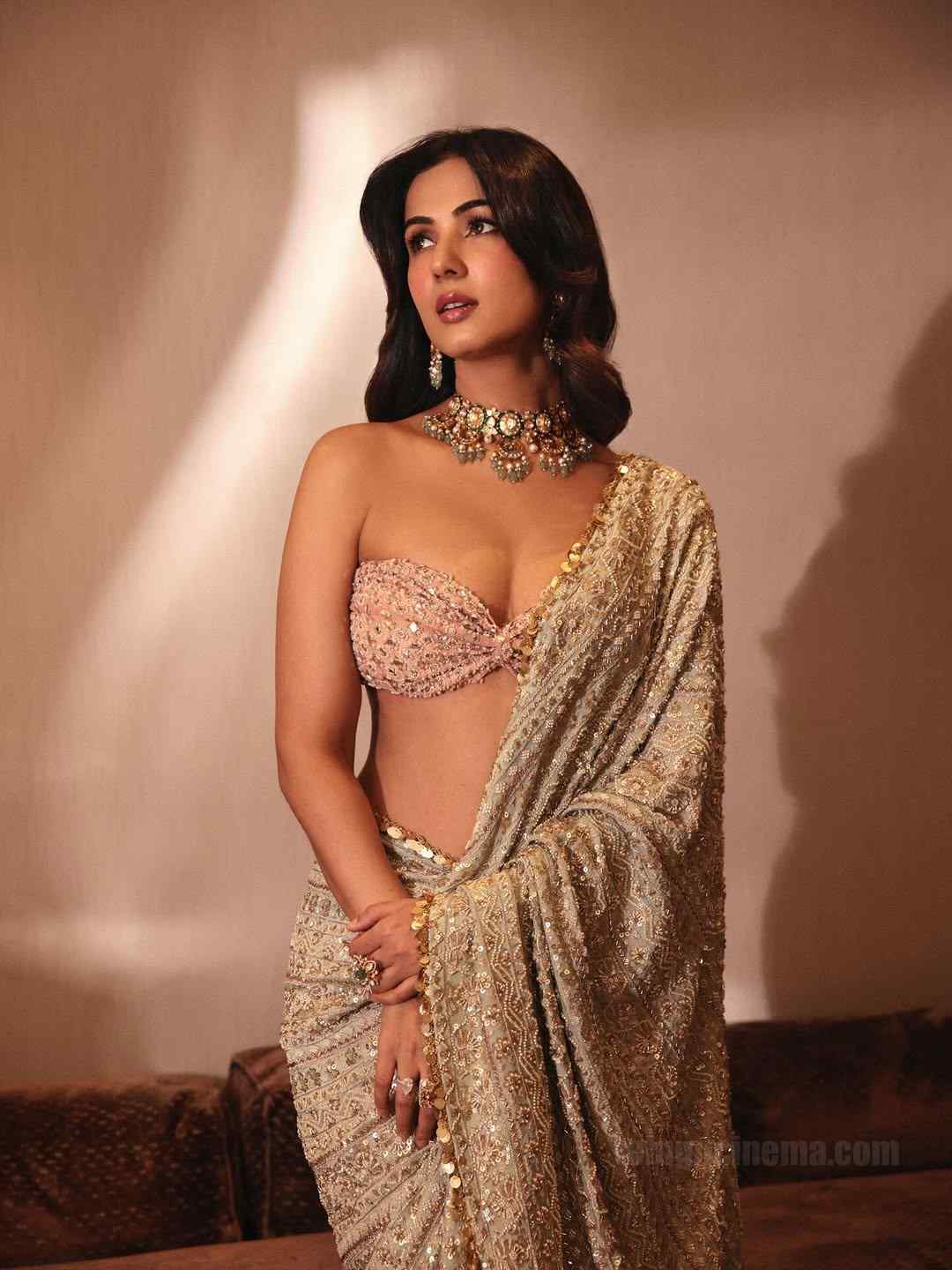 Sonal Chauhan stuns fans with her elegant look in a sleeveless blouse paired with a golden-hued saree, setting social media abuzz with her latest glamorous appearance.